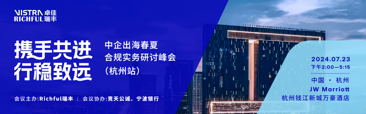 “攜手共進(jìn),行穩(wěn)致遠(yuǎn):中企出海春夏合規(guī)實(shí)務(wù)研討峰會”活動于今日7月23日下午在杭州錢江新城萬豪酒店成功舉辦。本次峰會由Richful瑞豐發(fā)起和主辦,聯(lián)合Vistra卓佳、競天公誠、寧波銀行協(xié)辦,吸引了近百位來自華東地區(qū)的企業(yè)高管報(bào)名參會。