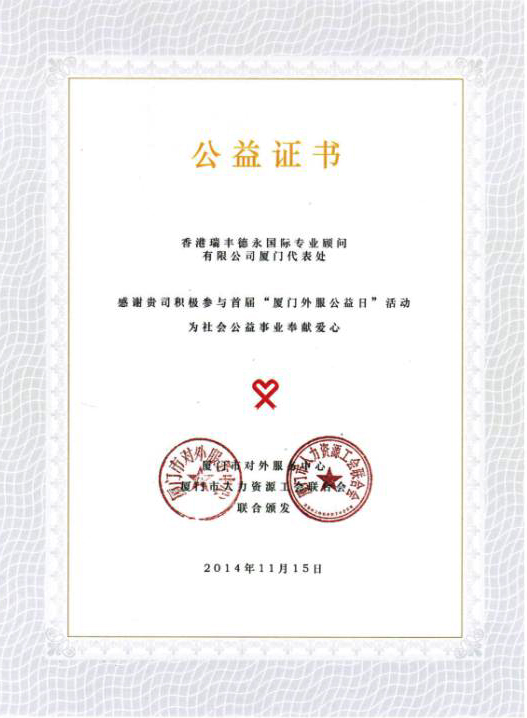 主辦單位:廈門對(duì)外服務(wù)中心頒發(fā)公益證書