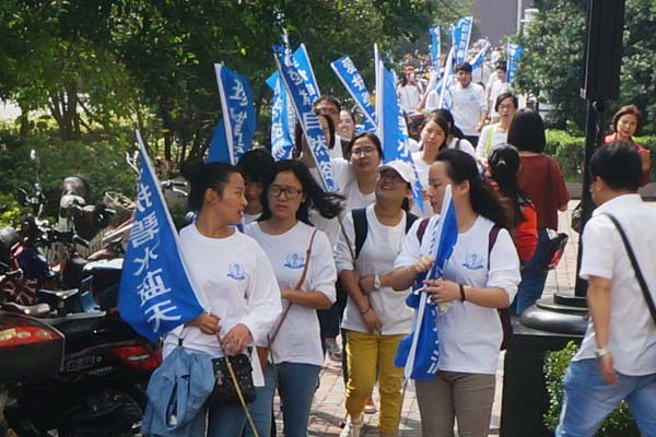 一早,全體在西湖邊集合,大家手舉此次活動(dòng)宣傳口號(hào)【珍惜自然資源?愛(ài)護(hù)碧水藍(lán)天】的旗幟,在人群密集的東坡路、湖濱路游行。