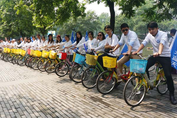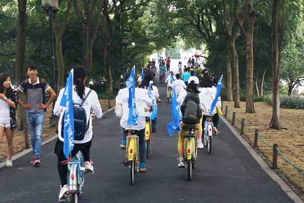 派發(fā)紀(jì)念品完畢,大家重新集合,單車環(huán)繞西湖一周,由東坡路始發(fā)、沿南山路,經(jīng)蘇堤、北山路再回到東坡路,全程約10公里。一路旗幟飄揚(yáng)、煞是壯觀,更有沿路行人問(wèn)隊(duì)伍是來(lái)自哪里,做什么的。