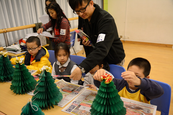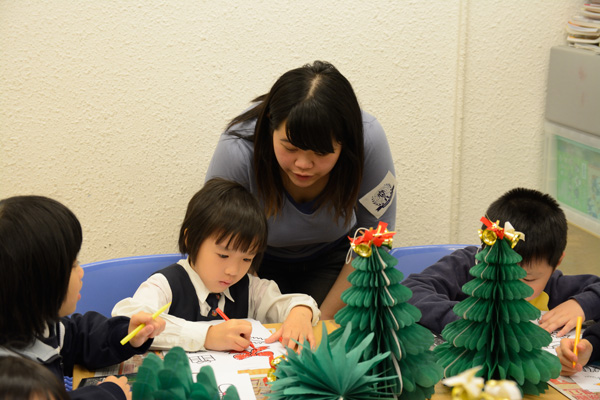 我們教小朋友制作、剪裁并鼓勵(lì)小朋友自己發(fā)揮創(chuàng)意設(shè)計(jì)圣誕樹的造型,大家坐在一起動(dòng)手制作創(chuàng)意圣誕樹,不時(shí)傳出的談笑聲讓整個(gè)課室的氣氛非常溫馨。