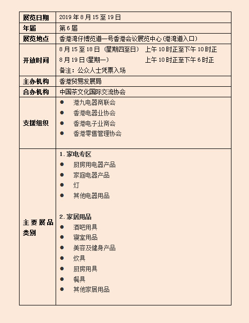 香港貿(mào)發(fā)局家電.家品.博覽為業(yè)界提供一個理想平臺,讓展商推介新產(chǎn)品,強(qiáng)化品牌及推廣優(yōu)惠給公眾。超過180家參展商參與2018年博覽。博覽與香港貿(mào)發(fā)局主辦的美食博覽、香港國際茶展及美與健生活博覽同期舉行。2018年共吸引510,000名參觀人士。