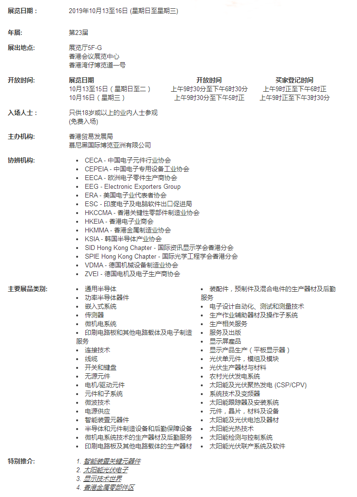 國際電子組件及生產(chǎn)技術(shù)展2019為供應(yīng)商創(chuàng)造一個(gè)高效環(huán)境,與來自全球電子行業(yè)買家作更緊密的聯(lián)系。2018年,國際電子組件及生產(chǎn)技術(shù)展與香港貿(mào)發(fā)局香港秋季電子產(chǎn)品占組成了全球最大電子平臺(tái),吸引來自139個(gè)國家和地區(qū),近87000名買家進(jìn)場參觀洽商。