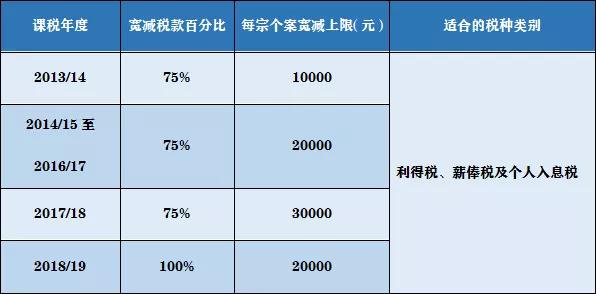 最新新條例將落實(shí)政府在2019年提出的稅務(wù)寬免,即寬減2018/19課稅年度100%的薪俸稅、個(gè)人入息課稅及利得稅,每宗個(gè)案以20,000元為上限。
