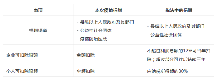為了企業(yè)和個(gè)人更好地制定所得稅稅收計(jì)劃,我們將本次疫情期間特殊捐贈(zèng)和稅法中的捐贈(zèng)對比列示如下供您參考: