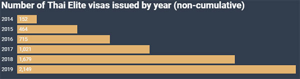 綜合上述的各類優(yōu)勢,(根據(jù)官方數(shù)據(jù)顯示)泰國的精英居留計劃(精英簽證)在2019年再次打破紀錄,會員人數(shù)比2018年增加了2149人,同比上漲28%。