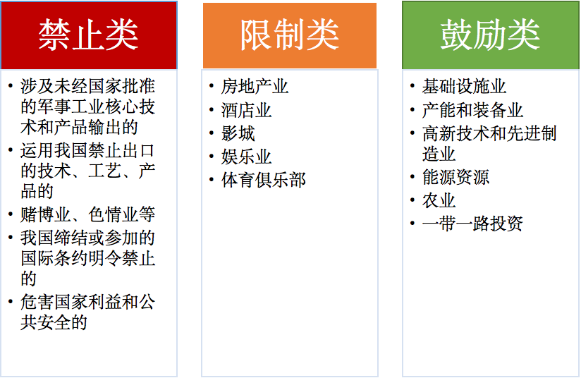 注意:與我國(guó)未建交、發(fā)生戰(zhàn)亂、我國(guó)締結(jié)的雙多邊條約或協(xié)議規(guī)定需要限制的敏感國(guó)家和地區(qū)開(kāi)展境外投資也是屬于限制類型。