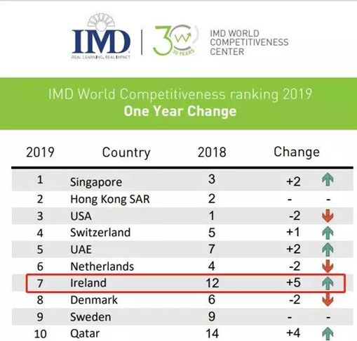 長期以來,愛爾蘭一直被視為通往歐洲市場及其5億人口的門戶,經濟方面,在瑞士洛桑國際管理發(fā)展學院(IMD business school)發(fā)布《2019年世界競爭力報告》排名中,愛爾蘭躍升至第七位,在歐盟成員里面排名第二!