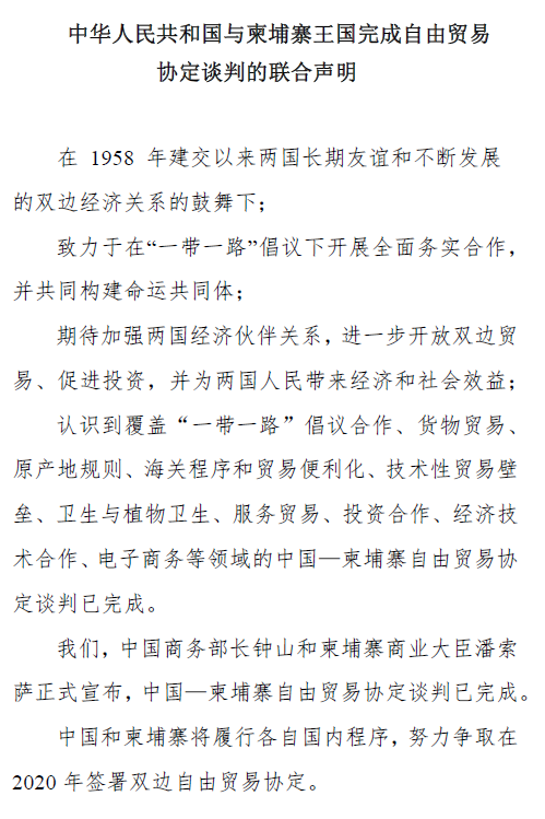 中國和柬埔寨7月20日共同發(fā)布《中華人民共和國與柬埔寨王國完成自由貿(mào)易協(xié)定談判的聯(lián)合聲明》,兩國將在2020年簽署雙邊自由貿(mào)易協(xié)定(FTA),自貿(mào)協(xié)議預(yù)計(jì)將從2021年1月1日起正式生效。中國自由貿(mào)易區(qū)“朋友圈”又添新成員!
