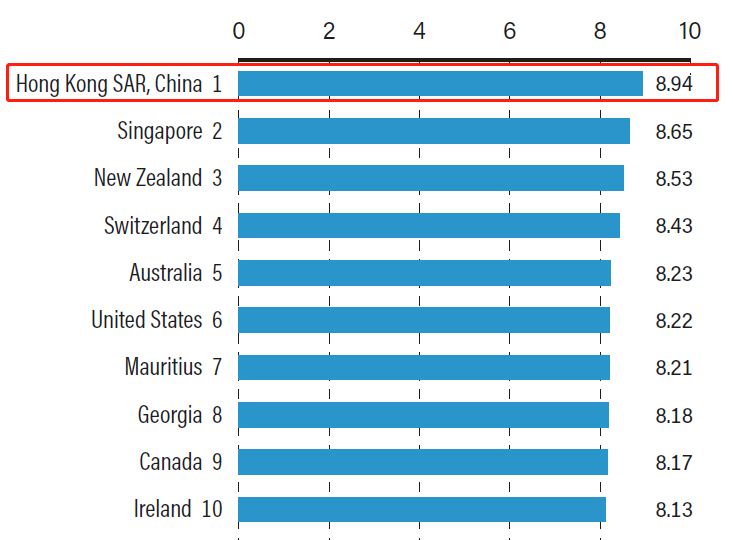 這份報(bào)告的最新綜合數(shù)據(jù)以2018年的為基礎(chǔ),香港以8.94分的綜合評分,再次位居榜首,新加坡、新西蘭分別以8.65分與8.53分位居第二與第三。