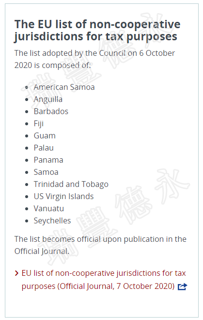 目前歐盟稅務(wù)不合作黑名單包含12個國家或地區(qū):美屬薩摩亞(American Samoa)、安哥拉(Anguilla)、巴巴多斯(Barbados)、斐濟(Fiji)、關(guān)島(Guam)、帕勞(Palau)、巴拿馬(Panama)、薩摩亞(Samoa)、塞舌爾(Seychelles)、特立尼達(Trinidad)和多巴哥(Tobago)、美屬維京群島(US Virgin Islands)和瓦努阿圖(Vanuatu)。