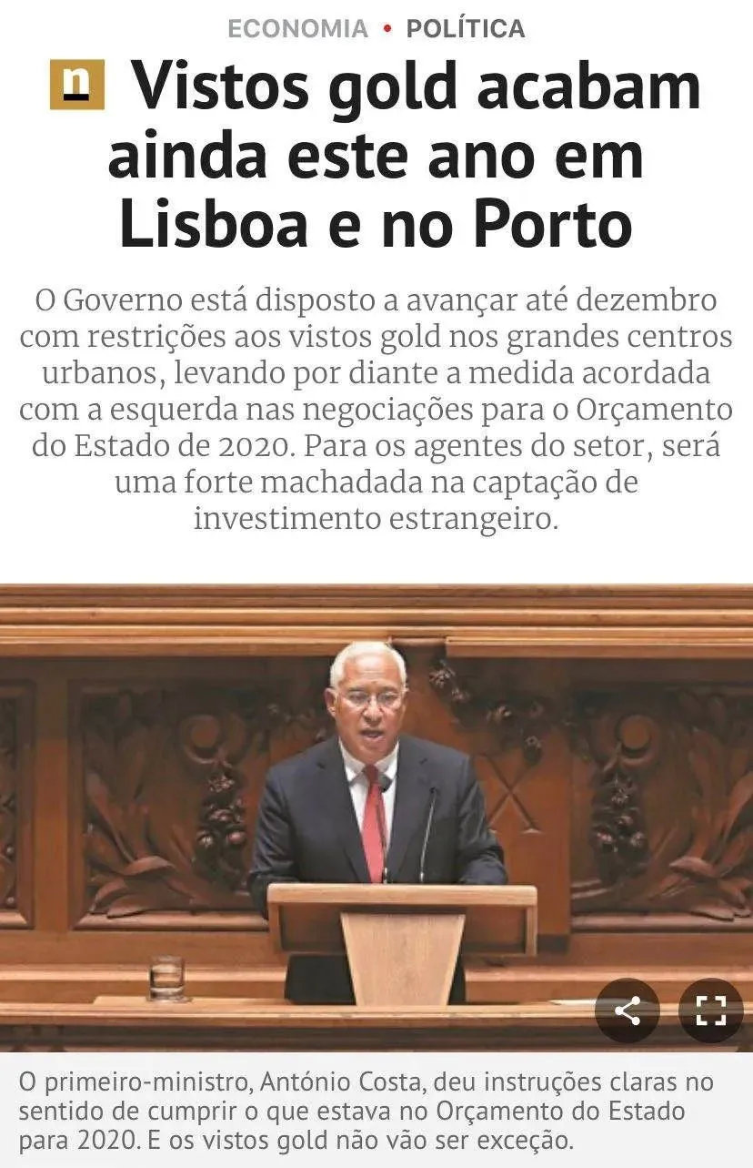 根據(jù)2020年葡萄牙國家預算法,黃金居留政策將于今年12月份在里斯本、波爾圖等大都市區(qū)中止。