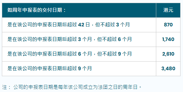 以本地私人公司為例,本地私人公司須每年于公司成立為法團之日在該年中的周年日后的42日內(nèi)交付。