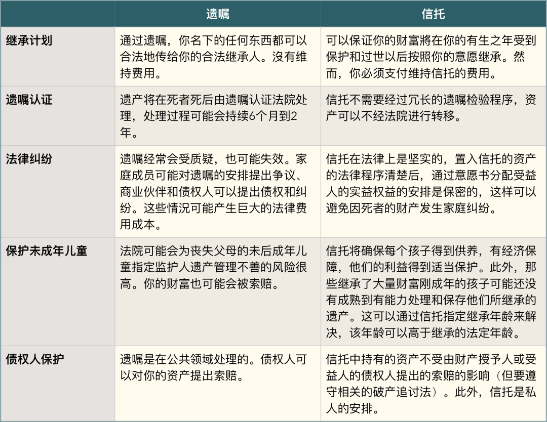 遺囑,就是對財產(chǎn)授予人的財產(chǎn)進行分割,然后給予遺囑上列明的家庭成員,一般情況下,都是一次性切割分配。但對私人財產(chǎn)授予人來說,信托比遺囑更進一步,在財產(chǎn)授予人在世期間和過世后,為財產(chǎn)授予人的家人和后代提供資產(chǎn)保護。因為家庭成員的情況和需求都是不同的,遺囑并不能很好地考慮到這部分因素,信托不僅能夠保證他們的資產(chǎn)安全,而且可以根據(jù)他們的意愿和需要作合適的分配。比如,家庭成員中,有未成年子女、孫輩、殘疾或有特殊需要的家庭成員,他們需要被特殊照顧,信托就可以比遺囑更好地實現(xiàn)這部分需求。財產(chǎn)授予人可以確定受益人何時能收到他們的分配,收到多少,從而確保他們辛苦掙來的財富不被浪費并且被明智地利用。