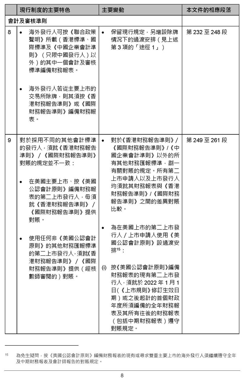 咨詢總結(jié)文件顯示,海外交易所除牌公司,可獲12個(gè)月寬限期轉(zhuǎn)用《香港財(cái)務(wù)報(bào)告準(zhǔn)則》或《國(guó)際財(cái)務(wù)報(bào)告準(zhǔn)則》編寫財(cái)務(wù)報(bào)表,三年年內(nèi)豁免符合適用的《上市規(guī)則》條文(例如年度審閱、金額上限),而港交所會(huì)保留權(quán)利,要求發(fā)行人股份簡(jiǎn)稱加上標(biāo)記「TP」。