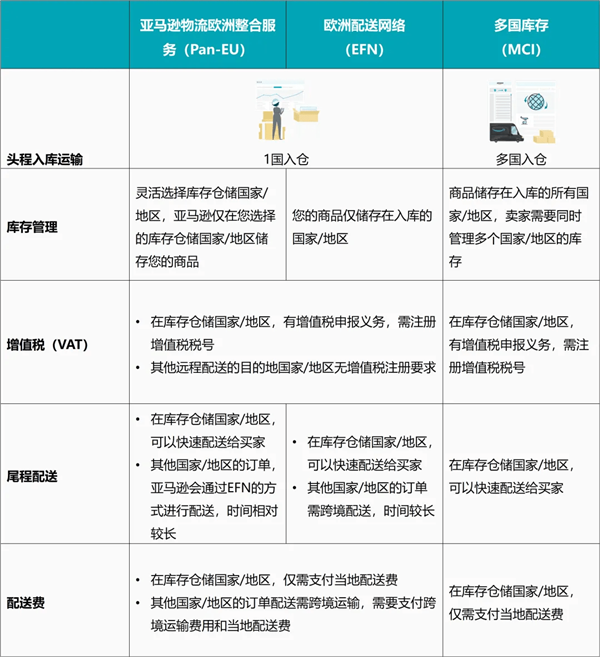 當(dāng)您注冊并上傳了更多歐洲國家的VAT稅號時,您可以根據(jù)自身需求,選擇使用亞馬遜物流歐洲整合服務(wù)(Pan-EU)和/或多國庫存(MCI)。下圖將這三種配送方式進(jìn)行簡單對比,供您參考。