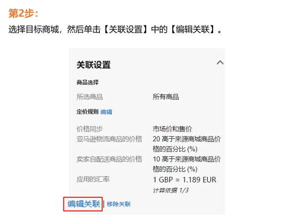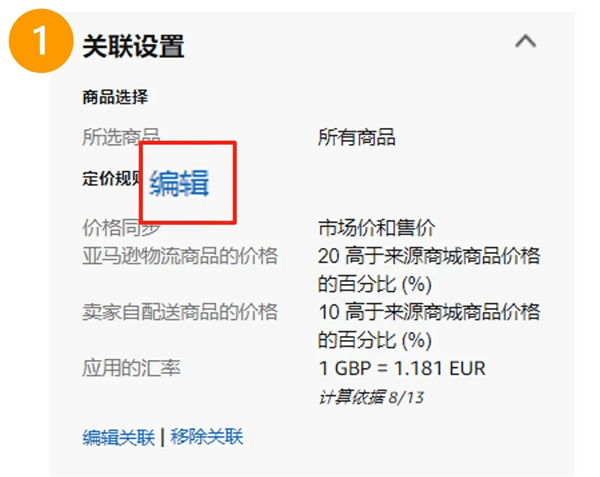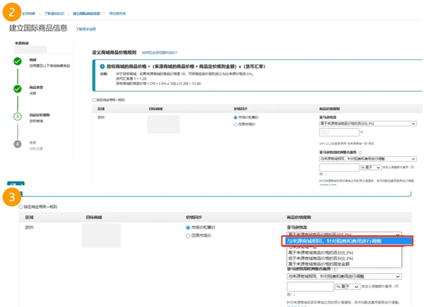 您可以通過:在【建立國際商品信息】頁面右側(cè)的關(guān)聯(lián)設(shè)置 > 點擊定價規(guī)則的【編輯】 > 在下拉菜單中選擇“與來源站點相同,針對稅費和費用進(jìn)行調(diào)整“來啟用這項自動定價規(guī)則。