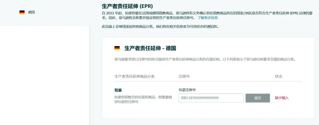 生產(chǎn)者責(zé)任延伸(EPR)是一項環(huán)境政策,要求生產(chǎn)者對其在市場上所推出商品的整個生命周期負責(zé),即從商品設(shè)計開始到商品生命周期結(jié)束(包括廢棄物收集和處理)。自 2022 年起,如果您要在法國/德國銷售商品,亞馬遜將有義務(wù)確認您在銷售商品所在的國家/地區(qū)是否符合生產(chǎn)者責(zé)任延伸(EPR)的要求。因此,亞馬遜將會收集并驗證您的 EPR 注冊號。