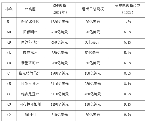 如圖所示,華盛頓哥倫比亞特區(qū)風(fēng)險最小,其對外貿(mào)易規(guī)模在GDP中的占比為1.5%。