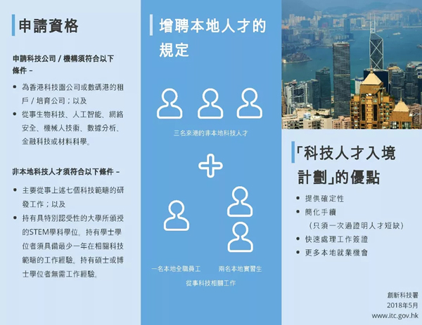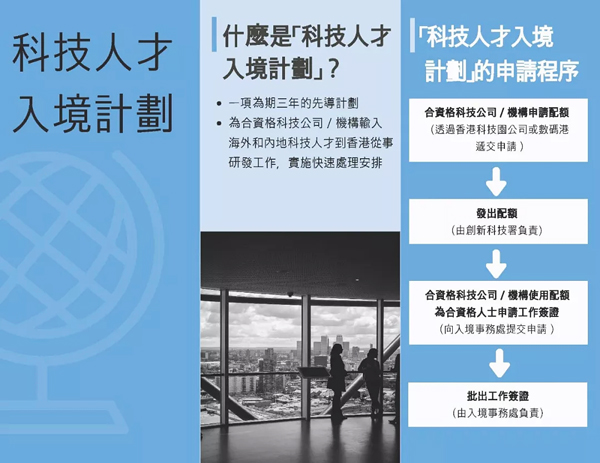 “科技人才入境計(jì)劃”(下稱“計(jì)劃”)是一項(xiàng)為期三年的先導(dǎo)計(jì)劃,旨在通過(guò)快速處理安排,為符合資格的科技公司(機(jī)構(gòu))輸入海外和內(nèi)地科技人才來(lái)港從事研發(fā)工作 。首個(gè)運(yùn)作年度引入最多1000名科技人才。
