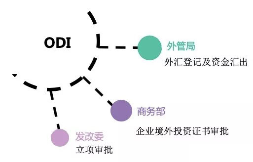 發(fā)改委核準(zhǔn)或備案→商務(wù)部核準(zhǔn)或備案→外匯管理局備案(銀行放外匯,外管局監(jiān)管)→實(shí)施ODI。