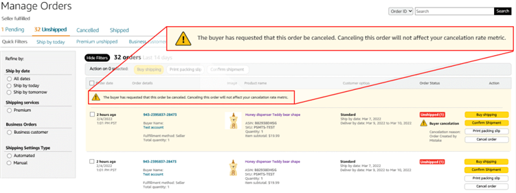 如果買家在下單30分鐘后請求取消,您可以在【管理訂單】頁面查看取消請求,該頁面位于訂單信息正上方,并帶有一條橫幅顯示“【買家已請求取消此訂單。取消此訂單不會影響您的取消率指標(biāo)】”。