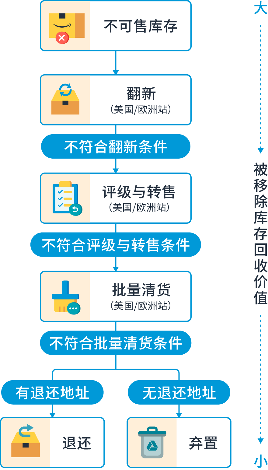 不可售商品的自動移除是指在亞馬遜運營中心的不可售庫存無須手動設置,將會被自動設定為“自動移除”,亞馬遜為這些不可售庫存增加了價值回收選項。