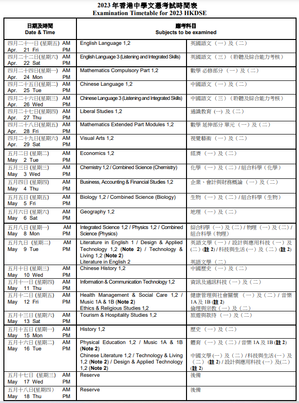 (1)DSE考試科目由4個(gè)核心科目加2-3個(gè)選修科目組成,大學(xué)錄取以最佳5門或最佳6門計(jì)算成績。