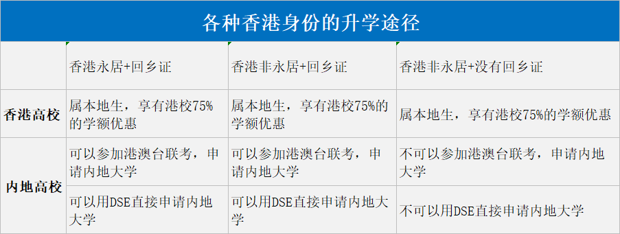 不管是永居還是非永居,關(guān)鍵點(diǎn)在于”回鄉(xiāng)證"。有回鄉(xiāng)證,就可以DSE和華僑生聯(lián)考的形式入讀內(nèi)地大學(xué)。無論是永居還非永居,只要有回鄉(xiāng)證就可以。無論有沒有回鄉(xiāng)證,只要有香港身份都屬于本地生,可以享受75%的學(xué)額優(yōu)惠。不過,無論是那種情況,要想DSE考試優(yōu)勢最大化,都需要持有香港身份。