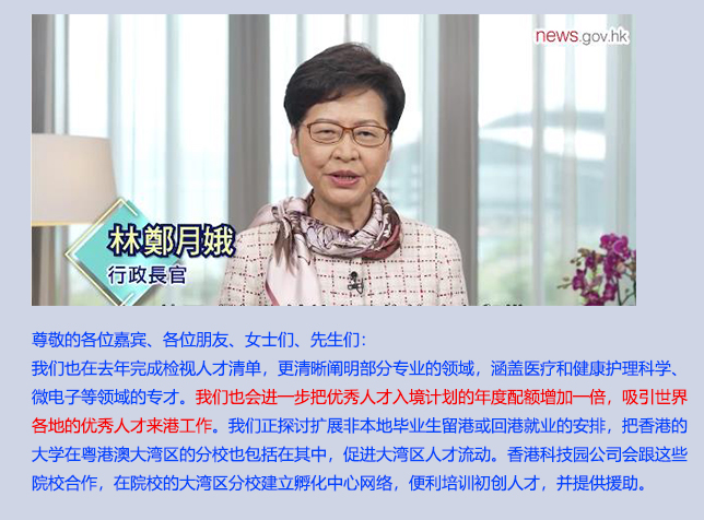 在第20屆中國國際人才交流大會(huì)上,前行政長官林鄭月娥表示,本屆政府銳意配合國家十四五規(guī)劃,把香港建設(shè)成為國際創(chuàng)新科技中心。在吸引人才上,優(yōu)秀人才入境計(jì)劃年度配額將倍增,當(dāng)局并正探討擴(kuò)展非本地畢業(yè)生留港或回港就業(yè)的安排。