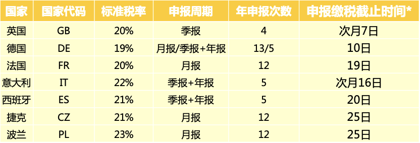歐洲各國VAT申報繳稅時間表