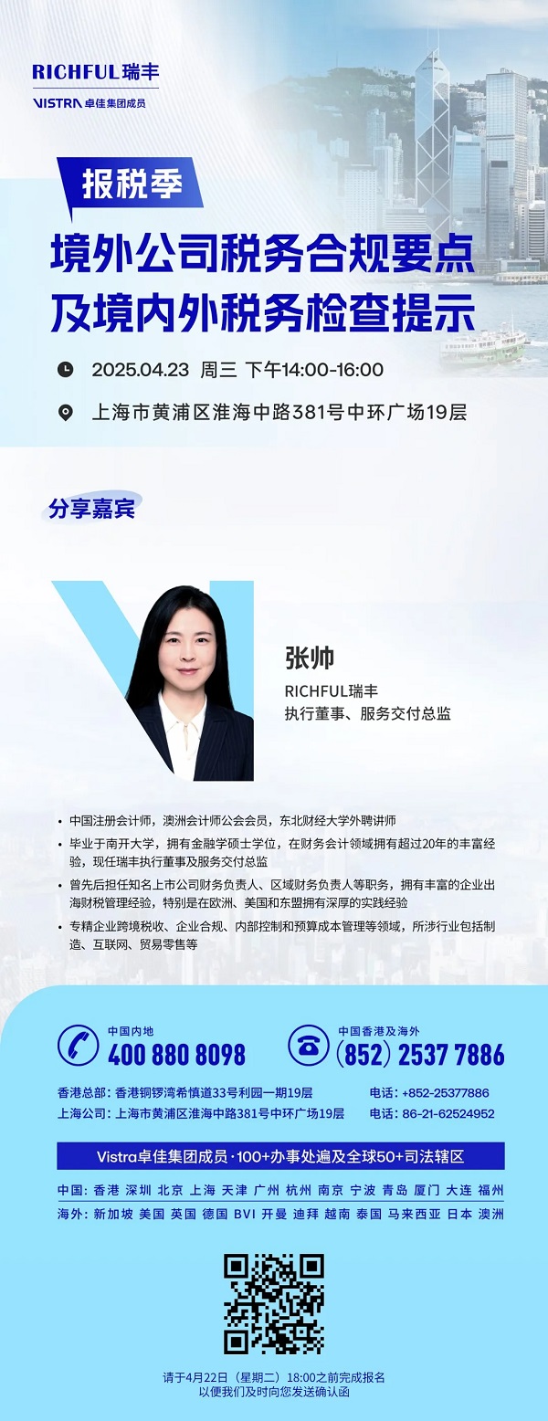 為幫助您更深入理解境外公司稅務合規(guī)要點,精準把握境內(nèi)外稅務檢查關鍵,我們誠摯邀請您參與以下專業(yè)活動。在活動中,您將獲得行業(yè)前沿的稅務知識與實操技巧,助力企業(yè)從容應對復雜多變的稅務環(huán)境。